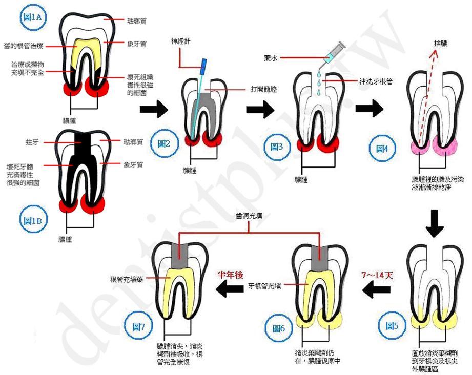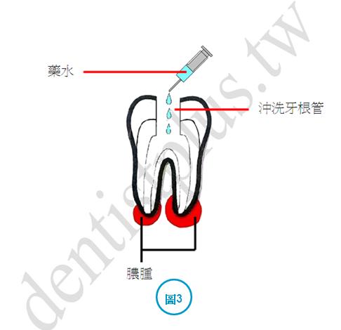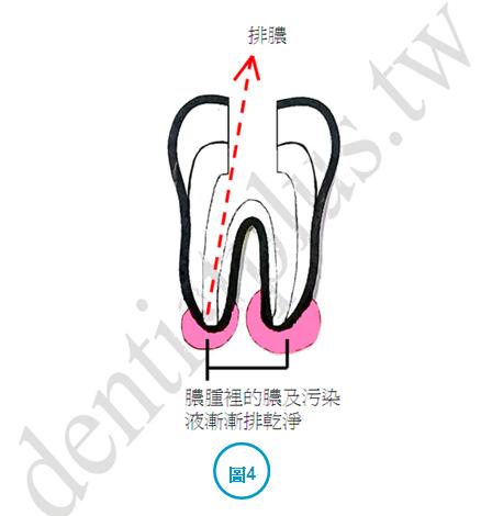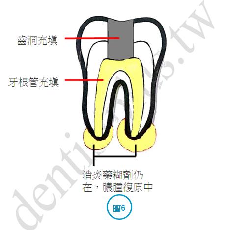 :圖5步驟在放入藥物後,患者24小時內會稍有腫脹感,通常48小時後會消失,若持續1個禮拜沒消失,或者腫脹感加劇,則表示膿腫仍有膿,需回到診所清除藥劑,再重覆牙根管沖洗、引流膿、換藥的步驟2~3回,之後再作圖5的步驟。