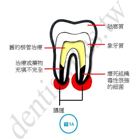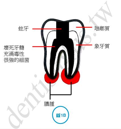 因嚴重拖延治療或原先根管治療不完整,沒有把壞死神經清除乾淨,讓壞死組織長期在牙根管內,細菌毒性大大增加,毒素從牙根尖竄出,破壞根尖齒槽骨,形成膿(囊)腫。