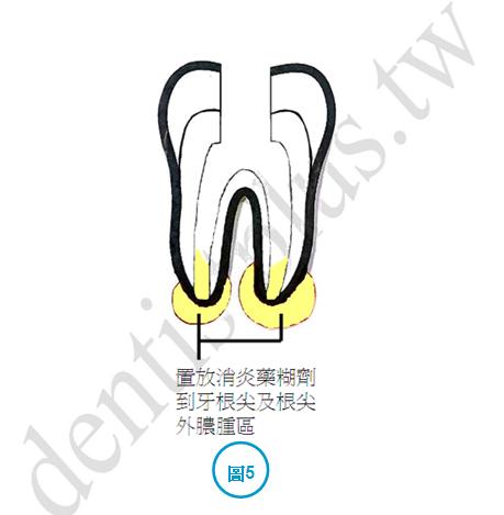 之後會打消炎藥糊劑到牙根尖及膿(囊)腫區(圖5),觀察7~14天。